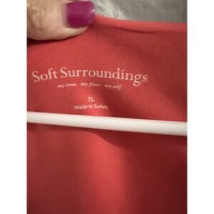 The Soft Surroundings Coral Pink Midi Faux Wrap Ruched Side Dress in size Tall L is a versatile and stylish piece perfect for various occasions. This dress features a flattering V-neckline, 3/4 sleeves, and a pullover closure for easy wear. Made from a comfortable blend of spandex and cotton, this dress is designed for all seasons and can be machine washed for convenient care. The coral pink color adds a touch of classic elegance, making it a great choice for business casual, workwear, or even a party or casual outing. The ruched details add a touch of sophistication to this chic and timeless wrap dress.
