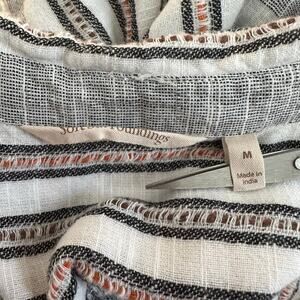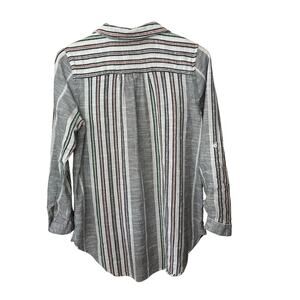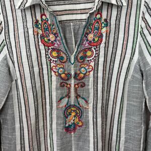 Soft Surroundings Floral Embroidered Tunic Top Medium Gray Black White Bohemian Shirt Roll Tab Sleeve Popover V Neck