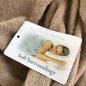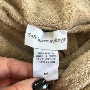 Soft Surroundings woman's cream long sleeve funnel neck sweater. Sweater has a drawstring neck and kangaroo front pocket. It's made of a very soft nylon and is new with tags. Sweater is a woman's size medium.