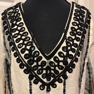 This sheath dress from Soft Surroundings combines a cream base with intricate black embellishments, creating a sophisticated look for casual or work settings. The V-neckline is adorned with ornate black patterns, while the long sleeves feature elegant black trim. Its straight silhouette offers a comfortable yet stylish fit, making it a versatile addition to any wardrobe.