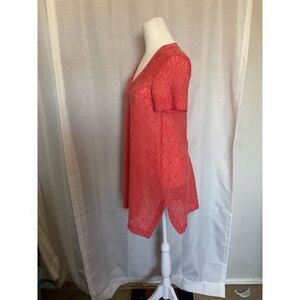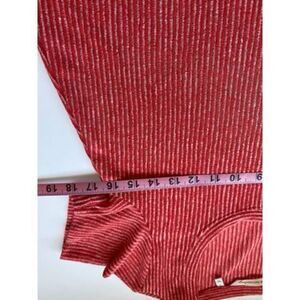 Size small..Vertical stripes gives this light knit shirt a visually slimming kick. Fluttery high-low hem, Aline shape, split side seams, Red-Orange and white stripes