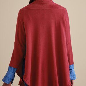 Keywords: Lagenlook Swingy Cardigan Plush Stretchy Sharkbite Cape Outerwear Layer Layering Wine Burgundy Maroon Purple Orange Raspberry Purple Red Claret Bordeaux Swingy Ruffle Ruffley Draped Drape Open Front Handkerchief Asymmetric Asymmetry Asymmetrical Robe Shrug