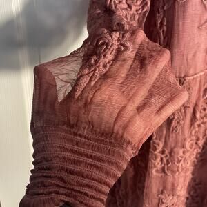 This gorgeous tunic dress is in excellent preowned condition. The outer silk layer is sheer. The body of the dress is lines, the sleeves are sheer. See photos for details and measurements. This item has been washed according to the label recommendations and stored in my smoke free home.