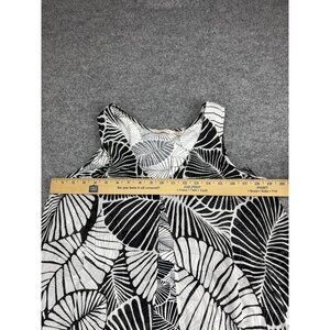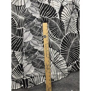 Color/Pattern: Black and white tropical leaf print with a contrasting leaf-print center front panel