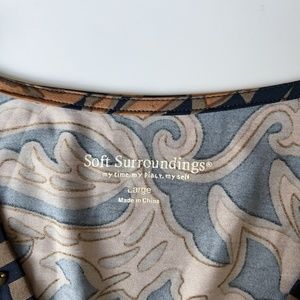 Please see photos for details. Photos are of the actual Soft Surroundings Embellished Blue and Brown V-Neck Tunic.