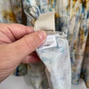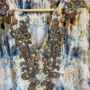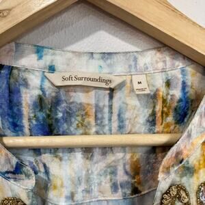 Beautiful Soft Surroundings tunic featuring a watercolor-style print with intricate beadwork and embellishment along the neckline. Flowy, lightweight, and perfect for boho or resort-inspired outfits.