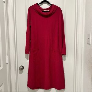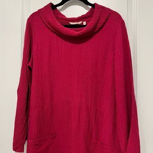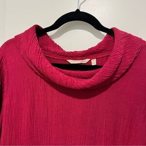 Beautiful berry burgundy cranberry lightweight material, convertible sleeves, not lined, 2 pockets and a midi style. Cowl neck.