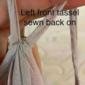 Minor flaws: Please see photos for close ups. Tassel on the front left shoulder has been sewn back on. Tassel on the back left shoulder has come loose (still attached) but could be sewn to be more secure. Alternatively, Some people have removed tassels completely which could also be done!