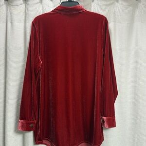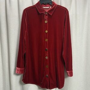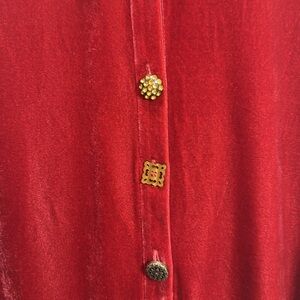 Elegant red velvet shirt. Features gold buttons.
