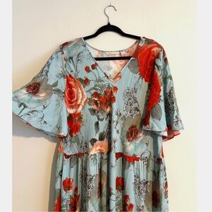 Welcome spring in this lightweight, drapey floral crepe dress by Soft Surroundings. It features flutter sleeves and a tiered maxi skirt that moves with ease. Slightly sheer and unlined, it’s full of flounce—just add a slip and you’re ready to swing through the season Great condition Measurements laying flat ~ (Length: 55") (Pit to Pit: 26") (Waist: 21.5")
