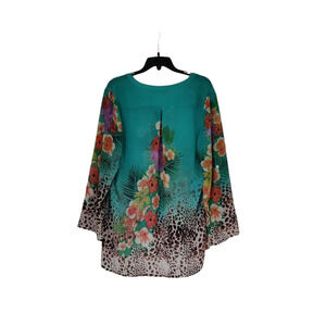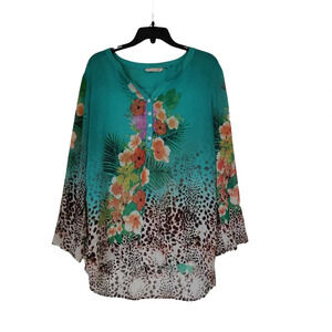 Soft Surroundings Floral Animal Print Popover Long Sleeve Sheer Blouse Sz L V-Neck Green Top