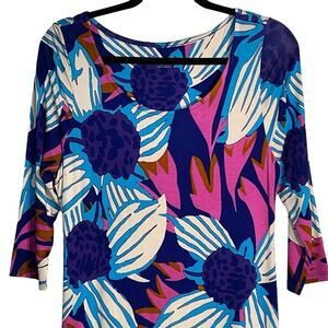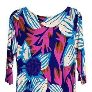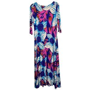 Vibrant Soft Surroundings maxi dress in a bold tropical floral print featuring shades of blue, pink, purple, and white. Crafted in a soft stretch fabric, this easy pullover dress offers a flattering drape and all-day comfort.