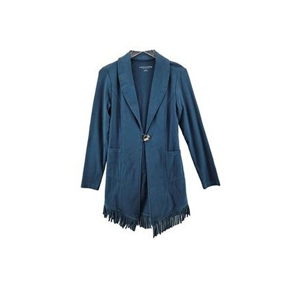 Soft Surroundings Fringed Jacket Small Teal Blue Mid Length Cotton Button Front