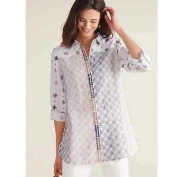 {Soft Surroundings} Gauzy Button-Down Embroidered Print Blouse - Medium