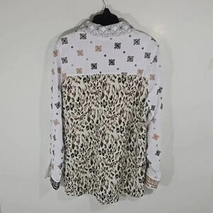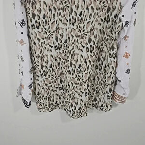 Gauzy woven button down tunic top. Floral embroidery and leopard print. Roll tab sleeves allow you to wear them long or rolled and cuffed.