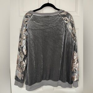 Absolutely stunning floral sequin design adorns the front of this knit jersey lined sweatshirt with Velour back panels. Super soft, as the brand implies this top allows you to go anywhere in comfort and style. No noted flaws other than some creasing lines in the velour.