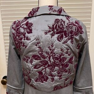 Collar and lapel has decorative velvet-feel embroidered floral design in burgundy and with shiny stitching