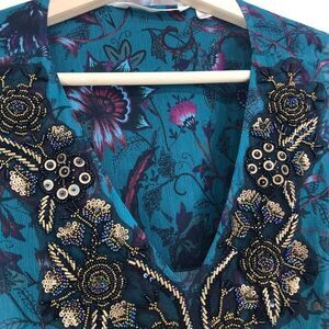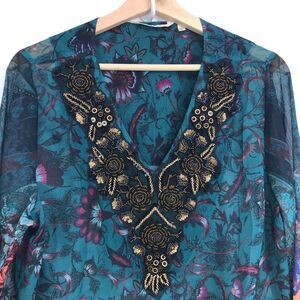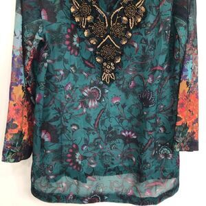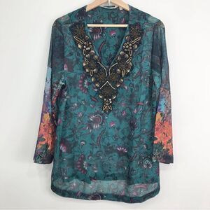 Soft Surroundings Green Semi Sheer Multi Colored Floral Beaded V Neck Tunic Blouse