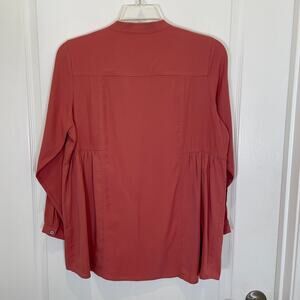 Rosy pink Halsey button down shirt by Soft Surroundings. Brand new without full tags attached (see pic #3). Soft Tencel blend fabric. Features long sleeves with button cuffs, front and side seam details, and a Hi-low style. Bust across the front area measures approx. 22 inches.