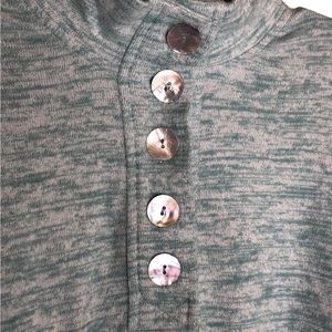 This is a beautiful Heathered teal pullover from Soft Surroundings. It has a mock neck with iridescent buttons. This top is SO soft and lightweight. It is 60% polyester, 38% cotton, and 2% elastane. It measures: 29.5 inches long, 25 inches underarm to underarm. Sleeve length is 24 inches. This is a great transition piece from the cold to spring. No rips or tears.