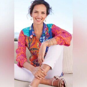 Description: Soft Surroundings Hermosa Floral Embroidered Tunic Top Blouse Long Sleeve with Shell/Mother-of-Pearl Buttons. Wear Open as a Shacket or even a beach cover-up. Jazz up your basic button-down look with this sensational medley of pattern and color! Extra length in the back so you can wear it with your favorite leggings. Long-sleeve/button down. Stunning embroidery on back. 100% Viscose. Machine wash.