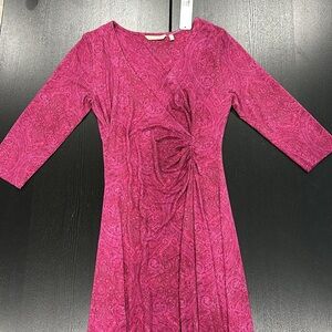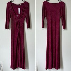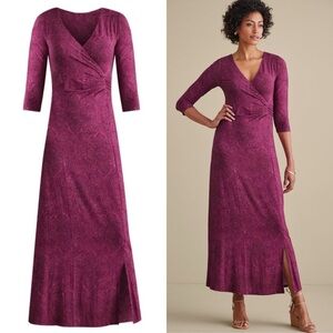 Soft Surroundings Hyannis Maxi Dress in Tapestry Multi Purple Color in size Small. New with tags. Magical draping and ruching create phenomenal waist shaping and figure flattery on this soft knit dress. In a berry-hued tonal tapestry, this vintage-inspired maxi features a surplice top. The effect is so slimming and chic. Front slit. 3/4 Length sleeves. No flaws.
