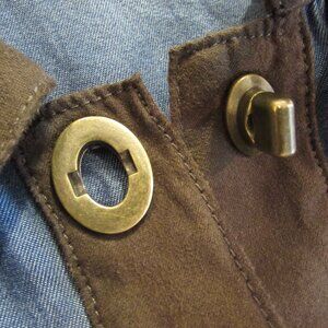 Blue 100% lyocell chambray denim with dark brown polyester suede trim. Toggle button closure. No pockets.