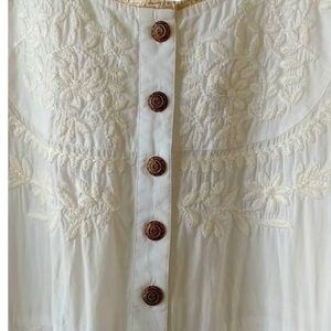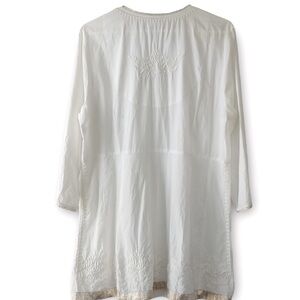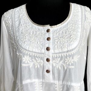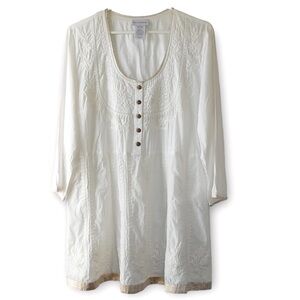 Soft Surroundings embroidered tunic top in ivory with metallic gold trim and detailed stitching. Features a relaxed boho fit, 5-button front, scoop neckline, and tunic length — perfect with leggings or jeans. Lightweight cotton, excellent condition.