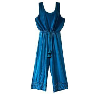 Soft Surroundings Wide Leg Sleeveless Jumpsuit Azure Blue has Side Pockets Scoop Neck Elastic Waist and Drawstring with Tassels has Embroidered Eyelet Lace at Cuffs and Keyhole Closure at Back of Neck with Button Closure Flattering Silhouette BOHO Bohemian Cottage Cottagecore Hippie Hippy Flower Child Flowy Festival Concert