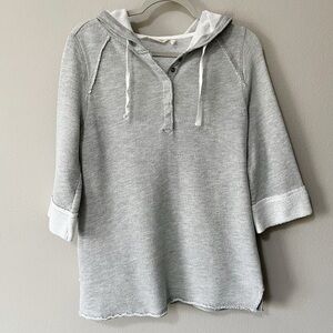 Soft Surroundings Just Beachy French Terry Cotton Hoodie Sweatshirt in light gray. Size small. 3/4 sleeves. Hood with drawstring. 1/4 snap closure. Side slits. Raw hems. Pre-owned, excellent used condition- writing on interior care tag.
