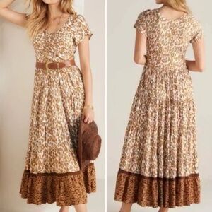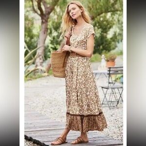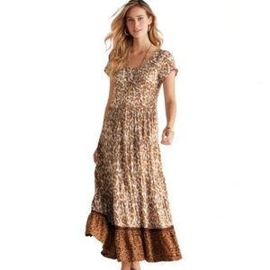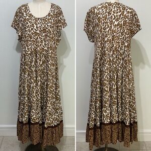 Soft Surroundings Kara Maxi Dress in White Mocha Leopard Print - 2X. Your soon-to-be favorite dress has all the breezy comfort you need for summer. This supremely feminine, woven style features a quintet of shirred tiers that drape from a modest scoop neck and flattering short sleeves. New with tags. No flaws. Looks great on its own or belted to add shape at the waist. Length is 50 inches from the top of the shoulder to the bottom while laying flat. Very soft, breathable, breezy, flattering, comfortable, and stylish.