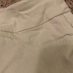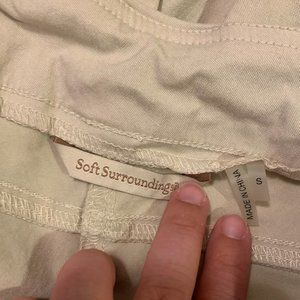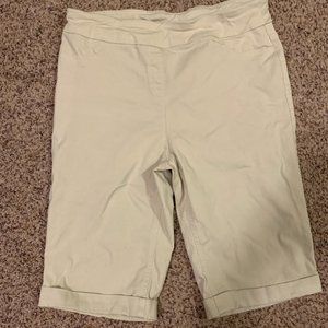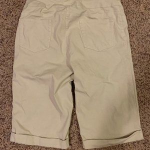 Comfy walking shorts from Soft Surroundings, similar to a bermuda style but more fitted. Size small. Khaki color, 2 front faux pockets and two functional pockets in back, cuffed hem. Only flaw is two small, barely noticeable pen marks above the pocket on one side, shown.