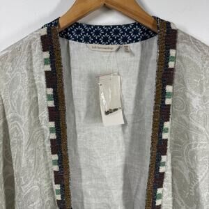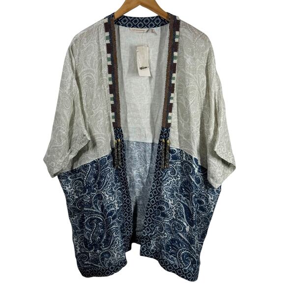 Soft Surroundings Kimono Women OS Still Water Linen Top Beaded Trim Tassel Blue