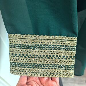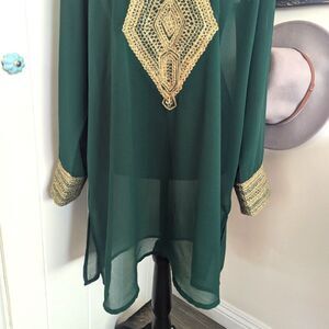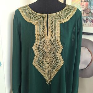 Description: Soft Surroundings Emerald Green Gold Embroidered Tunic sz LG EUC, beautiful, intricate embroidery down the front, on the front and back neckline and at the sleeve cuffs, side slits for easy movement, flowy, billowy silhouette