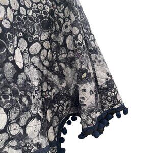 This Soft Surroundings kimono jacket in size L/XL features a stunning black and white batik print with a playful pom pom trim. Perfect for layering, this lightweight jacket adds a boho-chic touch to any outfit. The loose, flowing silhouette offers both comfort and effortless style, making it ideal for casual or dressed-up occasions. With its unique dyeing process, each piece has a one-of-a-kind look. Pair it with jeans or leggings for a versatile and stylish look that works for any season.