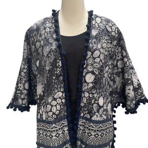 Soft Surroundings L/XL Kimono Jacket Batik Print Boho Chic Pom Pom Trim Festival