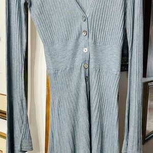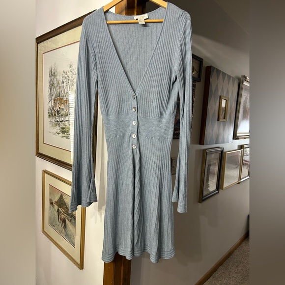 Chic ribbed cardigan/duster with V-neck and button details. Long bell sleeves for elegant style. Excellent preowned condition. Size medium. A beautiful dusty blue color. Smoke and pet free home. Ships immediately.