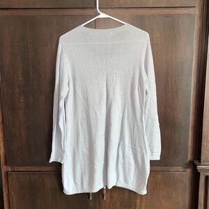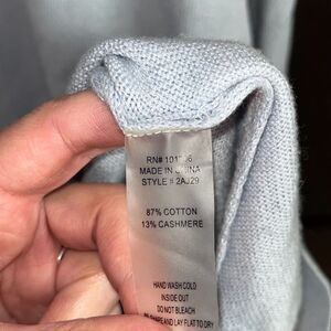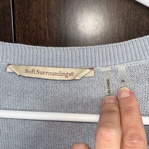 This sweater is made by Soft Surroundings. It’s a light blue v-neck, tunic length, cashmere blend sweater. Size medium and in very nice pre owned condition. Smoke and pet free home.