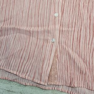 Women’s oversized boxy blouse top. Vertical stripes with button front. Short sleeve with ruffled trim and collar. Style 2BP80