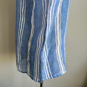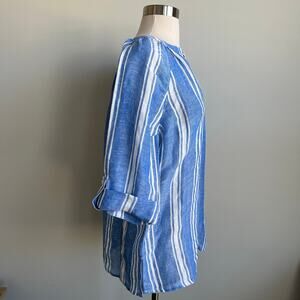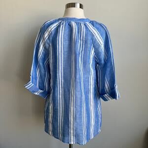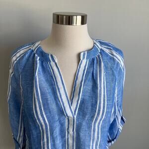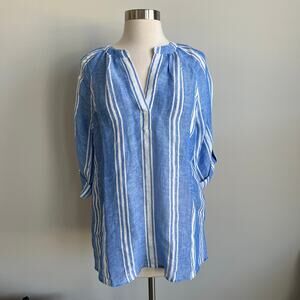 Soft Surroundings Linen Shirt V-neck Blouse Blue White Striped Resort Wear XS