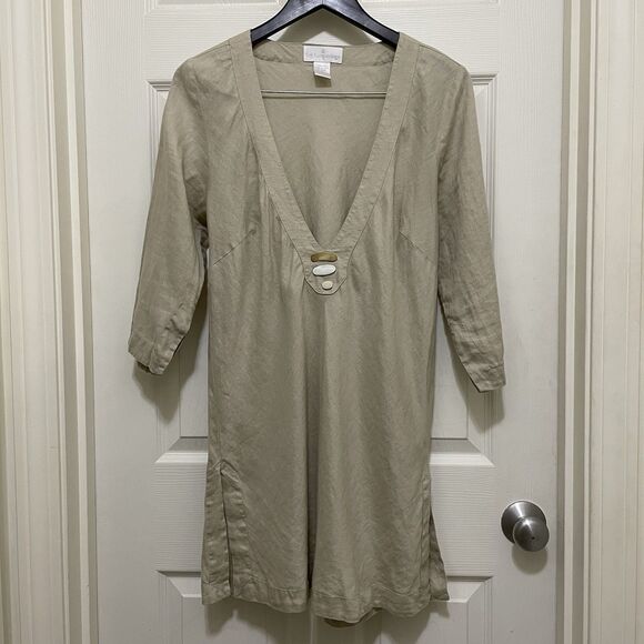 This is a Soft Surroundings 100% Linen Tunic in a natural color with polished stone accents. It is a womens size medium with a deep v-neck and 3/4 sleeves. Great for layering with a cami underneath or would be great as a bathing suit cover at the beach. It is in excellent preowned condition with no signs of wear. Measurements are included in the photos.