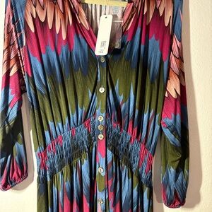 Soft Surroundings dress, blue, pink and green colors with long sleeves and v-neckline.