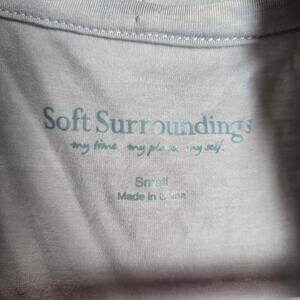 Soft Surroundings loungewear robe. Long sleeve. Has a gathered waist in the back to provide a nice shape and detail. Silvery gray. Front pockets. Inner tie and outer belt. Size small. Excellent condition.