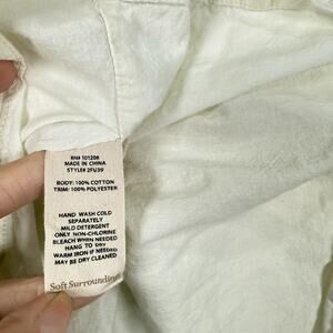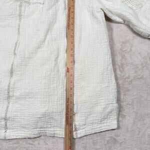 The Soft Surroundings Magnolia Gauze Top Blouse in Size L is a beautiful ivory blouse with crocheted trim and a V-neckline. Made from 100% cotton, this lined blouse features puff sleeves, a pullover closure, and a regular fit. Perfect for travel, parties, or casual wear, this tunic-style blouse is accented with crochet and embroidered details, adding a touch of bohemian charm to any outfit. Ideal for a beach, cottage, or classic look, this blouse is a versatile and stylish addition to any woman's wardrobe.
