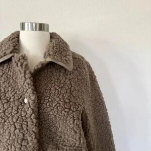 We're so in love with this jacket… It's the perfect, toasty sherpa pop-on. All the fashion details are so now: the hip length, the faux leather trim, the snap closures, the shirt-style faux flap pockets, and the hidden on-seam pockets. Polyester. Excellent condition.