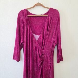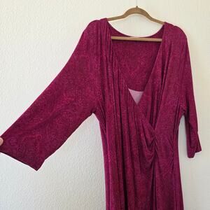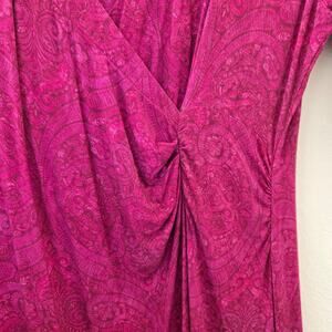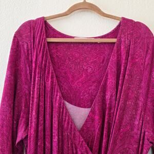 Beautiful and elegant Soft Surroundings maxi dress in a rich fuchsia pink color with an allover paisley print. Features a flattering surplice neckline with twist front draping, long sleeves, and a flowy A-line silhouette with side slit. Crafted from a soft stretch blend of viscose and spandex, this dress offers comfort with a touch of sophistication. Perfect for day-to-night wear, special occasions, or casual elegance.