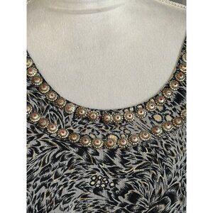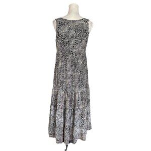 The Soft Surroundings Maxi Dress in size Small is a stylish and versatile piece perfect for various occasions such as travel, parties, casual outings, and work. This A-Line dress features a trendy animal print in black with white accents, a sleeveless design, scoop neckline, and tiered layers for added charm.