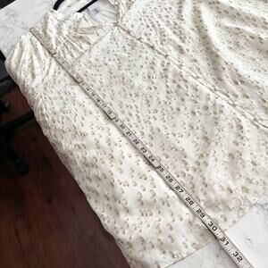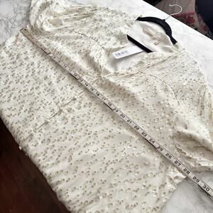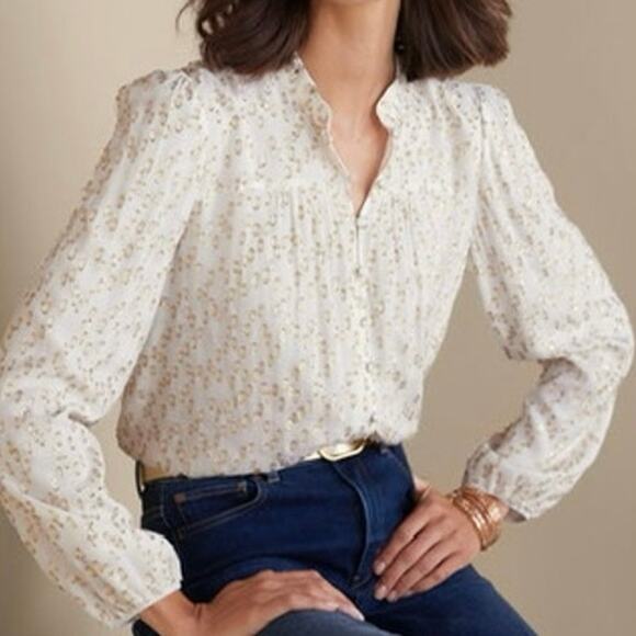 The season of sparkle is here and this blouse shines with a feminine silhouette and shimmery gold detailing. The lined bodice is lightly shirred, while the sheer puff sleeves have elasticized cuffs to keep their billowy silhouette in place. Covered buttons with elastic loop closures.