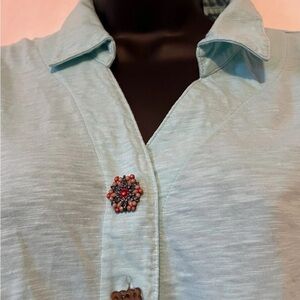 Elevate your wardrobe with this stylish sleeveless aqua/mint green top. Perfect for any occasion. Check out those amazing mismatched eclectic amazing buttons! If it were my size, I'd be keeping this one 🥰