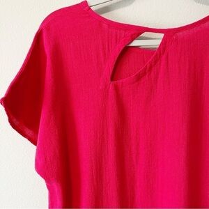 Soft Surroundings Moderne Gauze Tunic Top in pink/red. Size small. Can technically be worn as a dress as well. High low hem. Cutout details at front and back. Short sleeves. Pre-owned, excellent used condition- there is writing on interior tag.